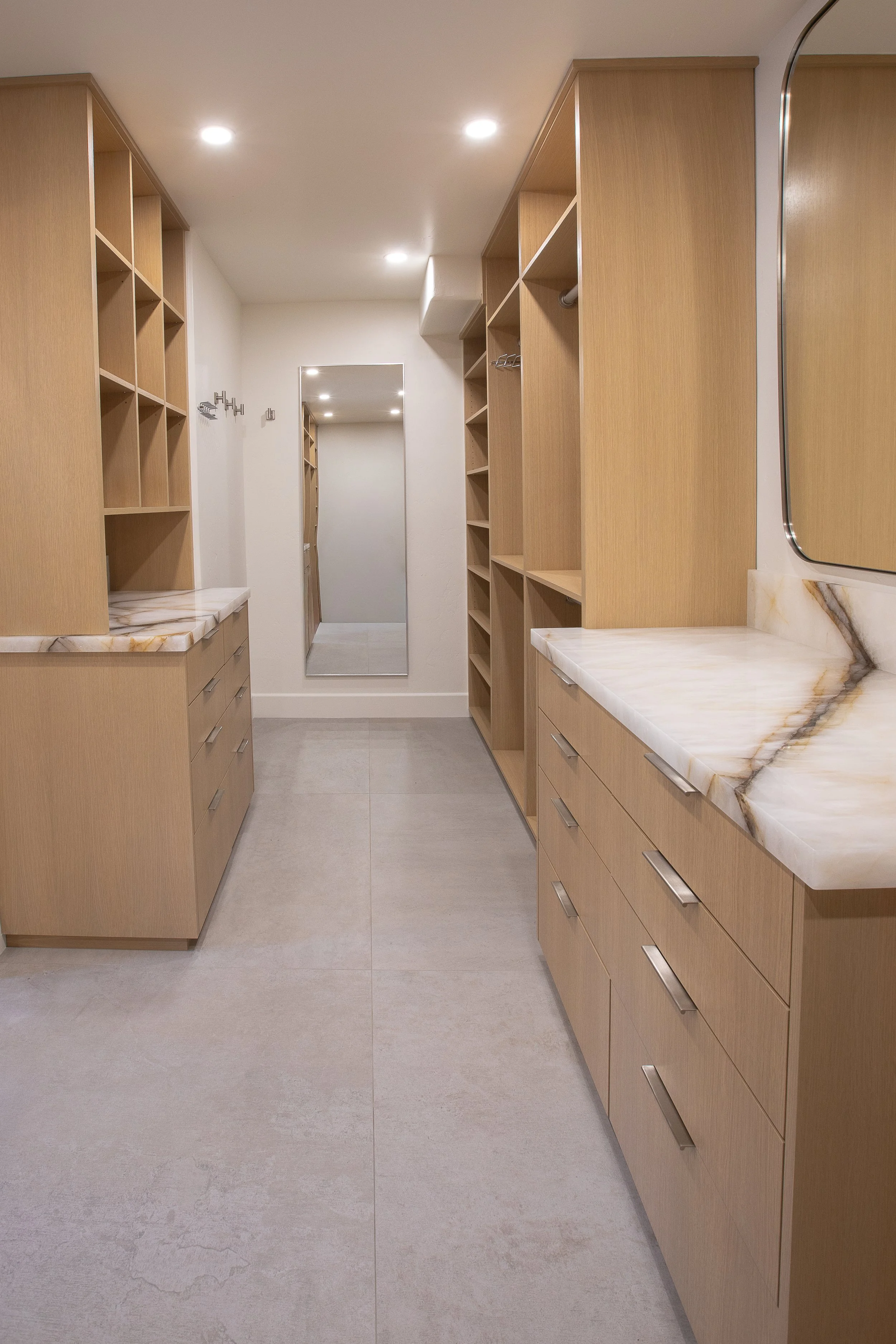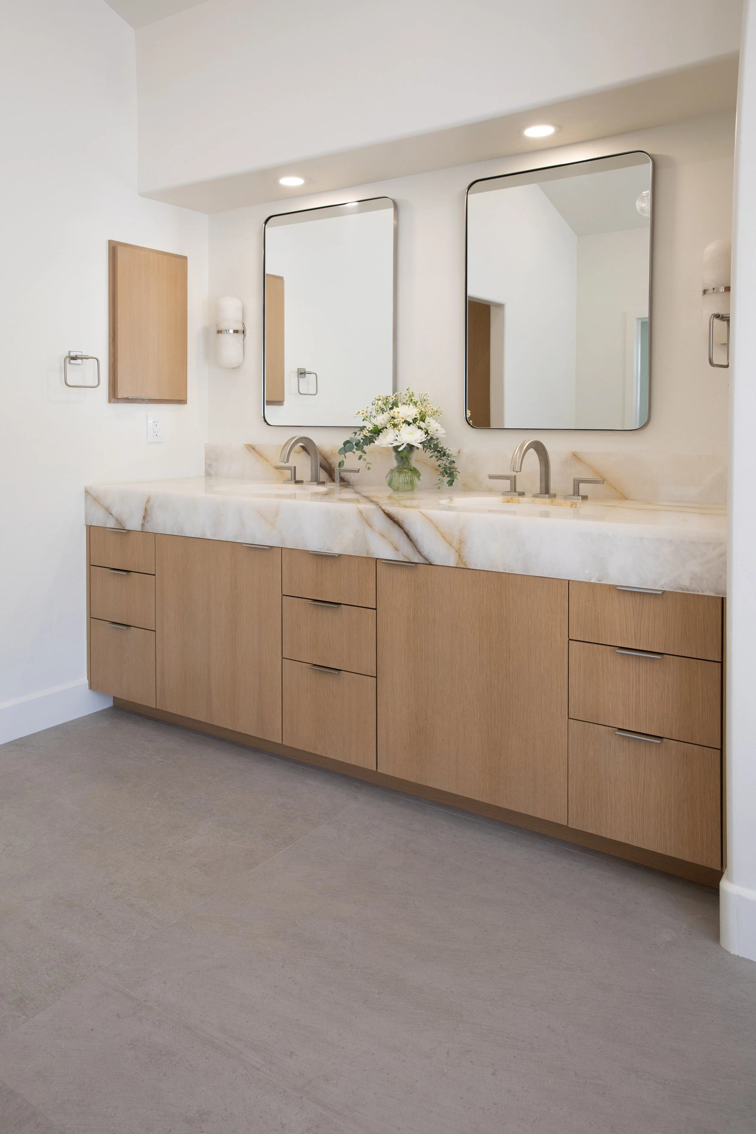 The flat-front white-oak vanity, creamy veined stone countertop, radius-corner mirrors, and alabaster sconces keep the lines clean and the palette soft-spa-like, uncluttered, and calming. Brushed hardware and quiet symmetry add refinement without feeling formal.